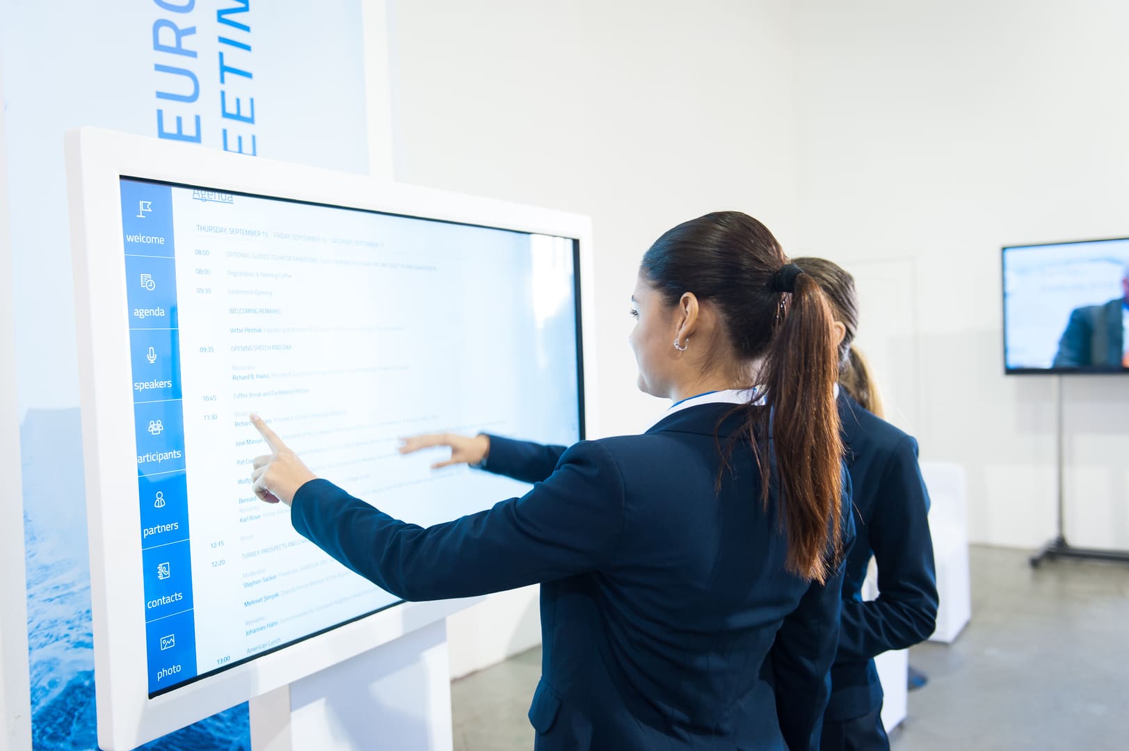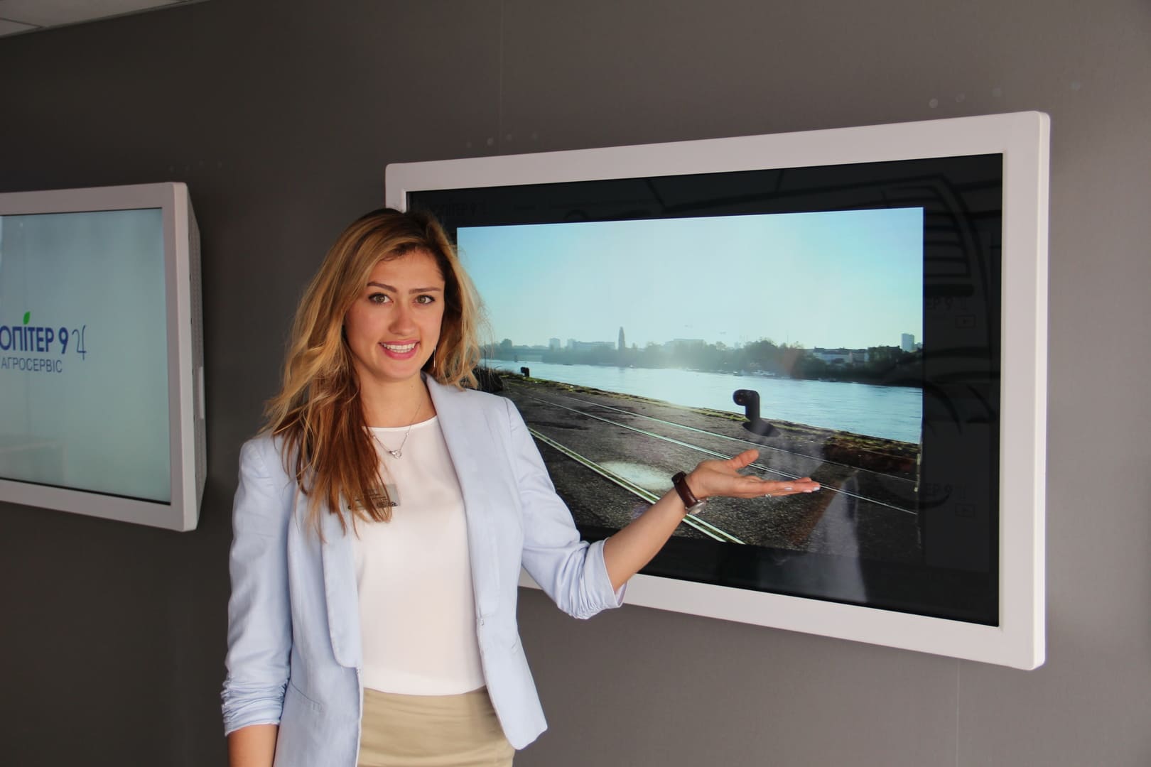 - Інтерактивний екран. Надає можливість перетворити повсякденну роботу з потоком інформації в новітню багатофункціональну платформу. Основні характеристики девайсу: інтуїтивно зрозумілий інтерфейс, висока швидкість торкань завдяки ІК-сенсору і мультитач, керування фото і відеозаписами. Є варіанти горизонтальної і вертикальної панелі для стіни або стійки. Система призначена для проведення навчальних уроків, презентацій рекламного характеру, виставок, переговорів тощо.